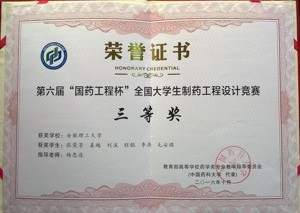 洪爷 学子喜获第六届全国大学生制药工程设计竞赛三等奖