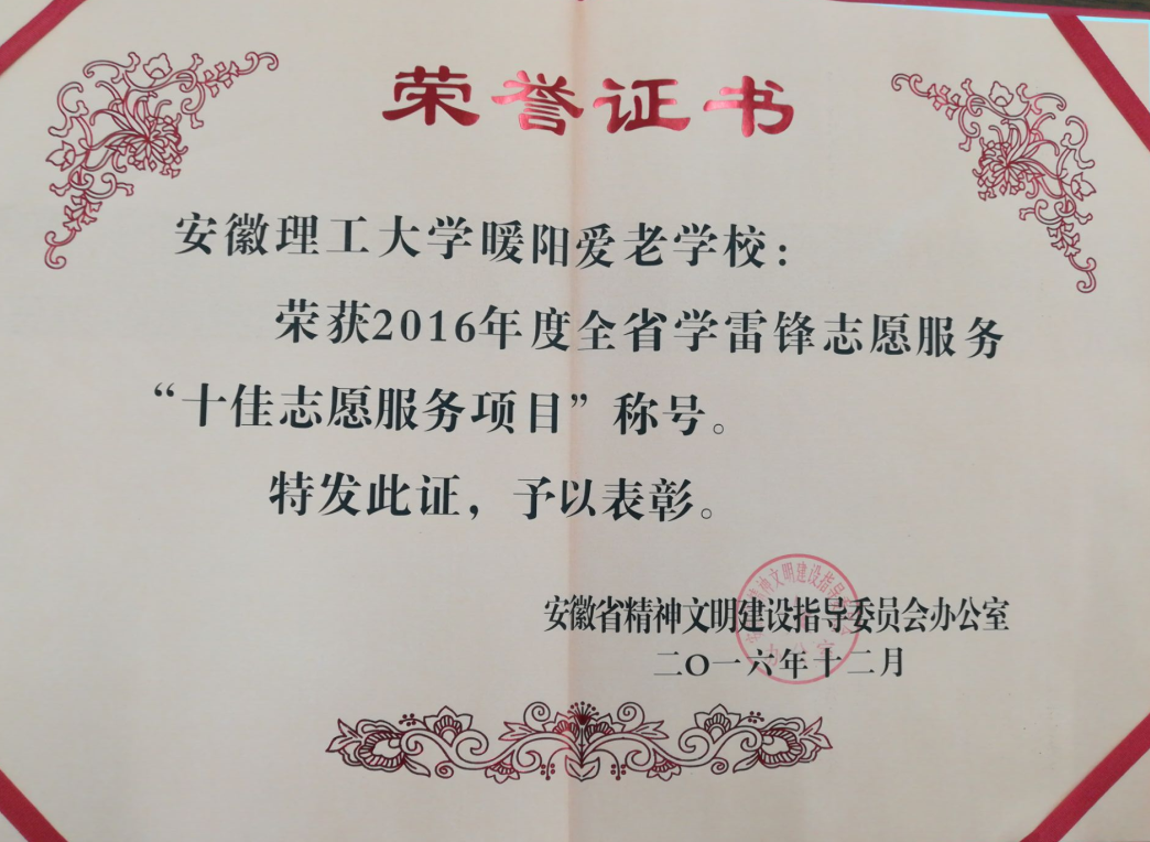 近日,从全省学雷锋志愿服务工作推进会上获悉,全省学雷锋志愿服务“四个十佳”评选揭晓,我校公益组织暖阳爱老学校获评全省2016年度学雷锋志愿服务“十佳优秀志愿服务项目”,这是继荣获2016年5月份十佳江淮志愿服务集体典型之后又一殊荣。